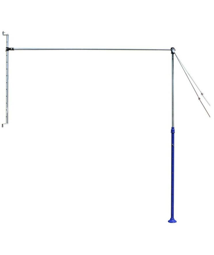 - Выполнена из 1-й напольной стойки и 1-й пристенной стойки, перекладины, 2-х растяжек ø-4 мм и 2-х закладных элементов (с прячущимся крючком для крепления растяжек к полу).