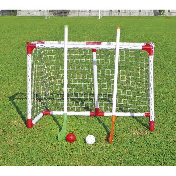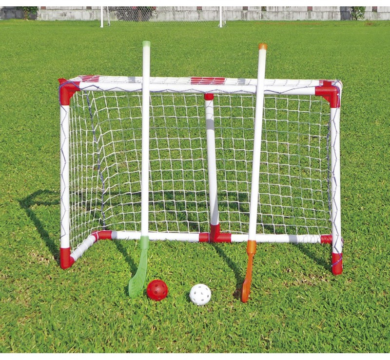 - В комплект входят ворота, нейлоновая сетка, 2 клюшки и 2 мяча