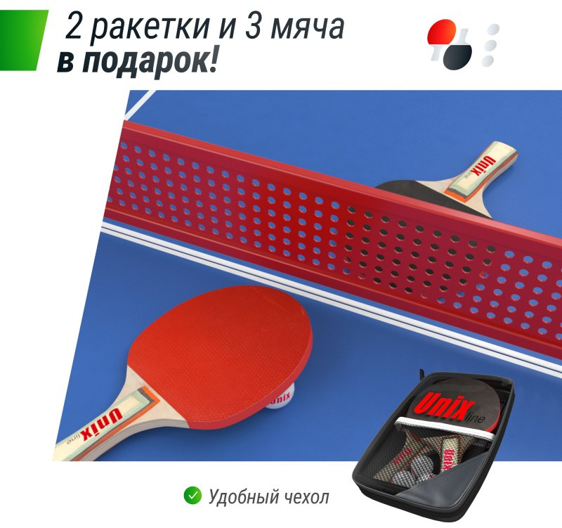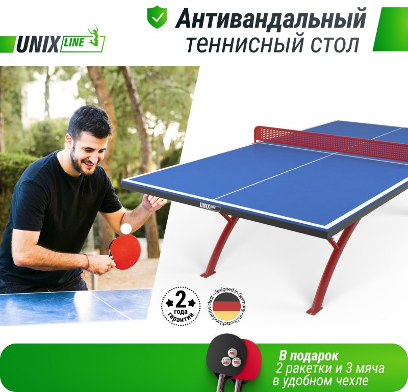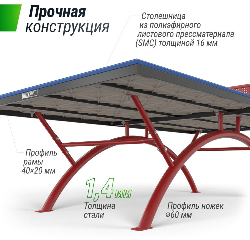Она не является горючим материалом, а также за счет высокой плотности и толщины столешницы (14 мм) обеспечивает великолепный отскок мяча и высокие игровые характеристики. Основой металлической рамы теннисного стола UNIX Line являются опоры из стальной трубы ?60 и толщиной 1,4 мм. Благодаря таким характеристикам конструкции теннисный стол сохраняет жесткость и устойчивость на любых покрытиях.