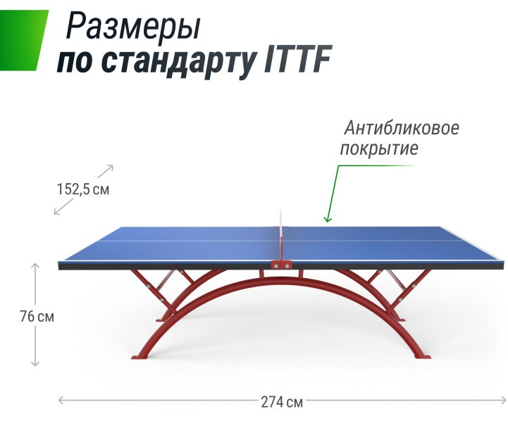 - В рабочем состоянии, диаметр х высота: 274 х 152,5 х 76 см (стандарт ITTF)