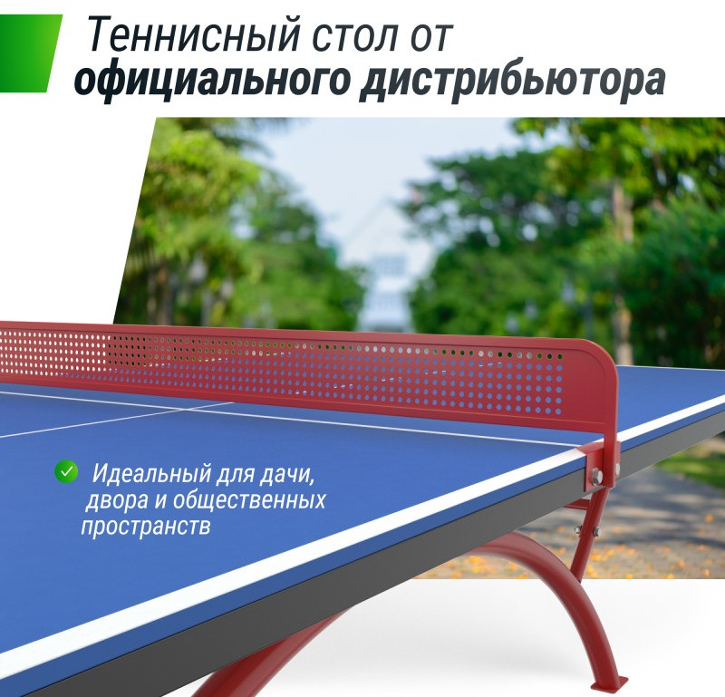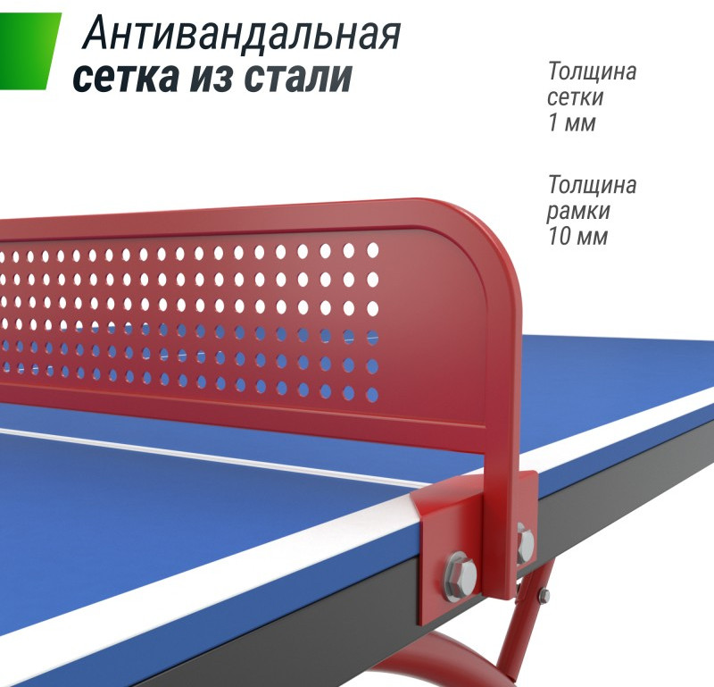 Антивандальная сетка с жестким креплением к столу изготовлена из стали толщиной 1 мм, толщина рамки составляет 10 мм. В подарок к столу идет набор для игры: 2 ракетки, 3 шарика в сумке. Укрывной универсальный чехол для стола не входит в комплект и приобретается отдельно. Защищает от мелкого мусора и листвы.