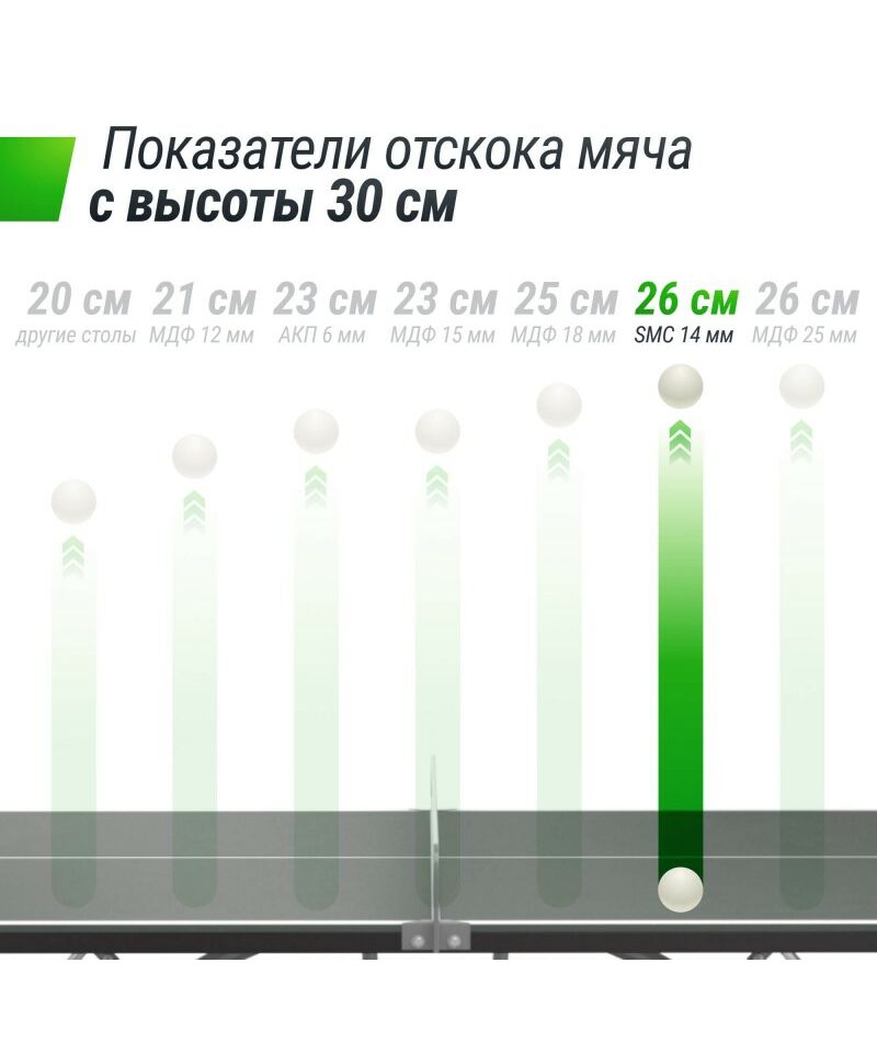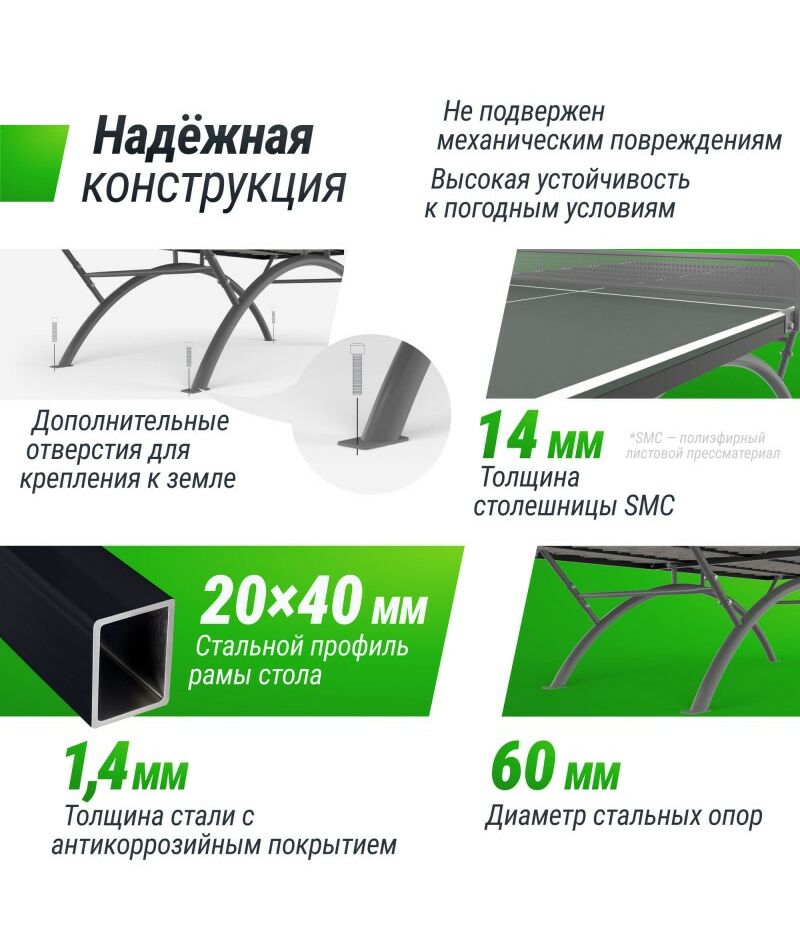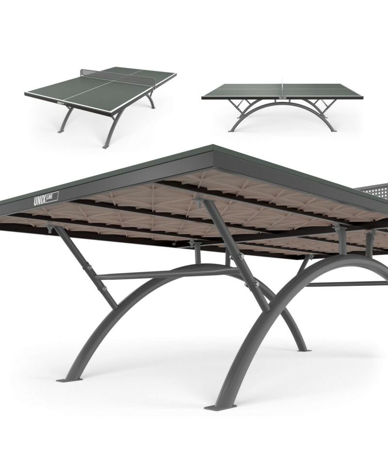 Столешница уличного стола UNIX Line изготовлена из SMС - панели с антибликовым покрытием и выдерживает многочисленные нагрузки, обладает хорошей устойчивостью к ударам, воздействию окружающей среды, влаге и температурным перепадам. Она не является горючим материалом, а также за счет высокой плотности и толщины столешницы (14 мм) обеспечивает великолепный отскок мяча и высокие игровые характеристики.