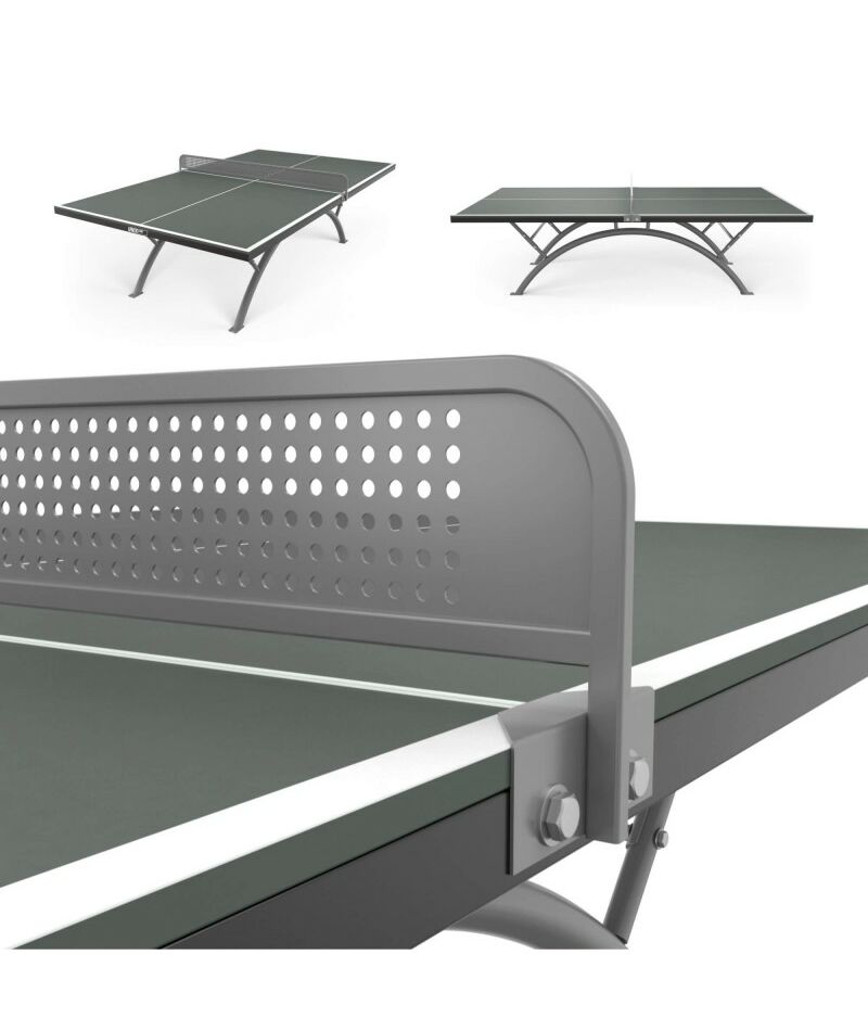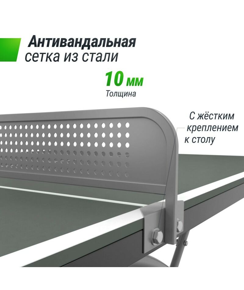 Антивандальная сетка с жестким креплением к столу изготовлена из стали толщиной 1 мм, толщина рамки составляет 10 мм. Благодаря этому, стол для пинг понга отлично подходит для эксплуатации как в частных домах и на дачах, так и в общественных местах, таких как парки, школы и кемпинги.