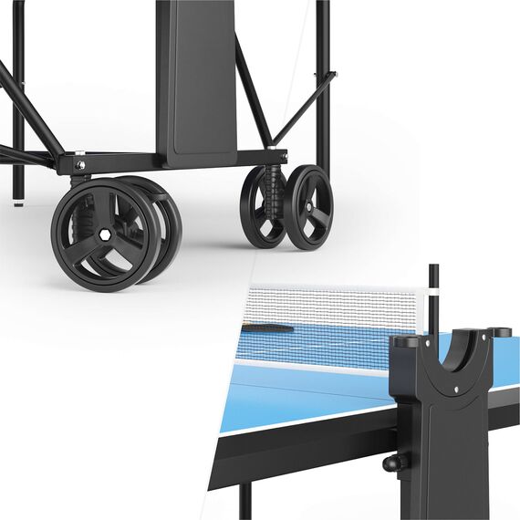 Стол построен на стальном каркасе 30x40 мм с толщиной 1,2 мм с антикоррозионным покрытием, что обеспечивает его жесткость и устойчивость на различных поверхностях. Опоры теннисного стола оборудованы компенсаторами неровности пола. Для транспортировки предусмотрены 4 сдвоенных маневренных колеса D155 мм с обрезиненным покрытием, поэтому стол легко передвигается в любое место без вреда для напольного покрытия. Для удобства и безопасности игровой стол оборудован надежным механизмом фиксации, который предотвращает скольжение стола во время игры.