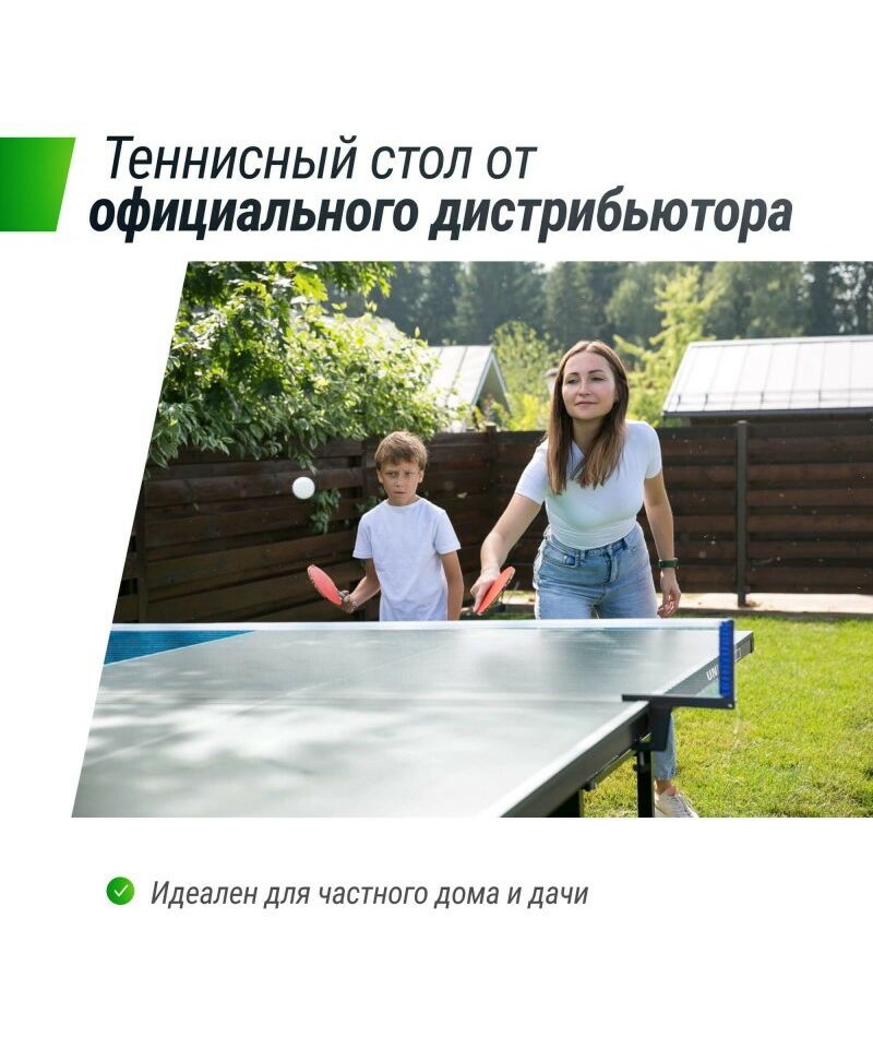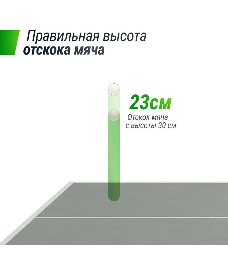 Столешница выполнена из композитной алюминиевой плиты с антибликовым покрытием, что делает ее устойчивой к самым экстремальным температурным нагрузкам, осадкам и придает отличный отскок мяча во время игры благодаря высокой плотности и толщине столешницы (6 мм).