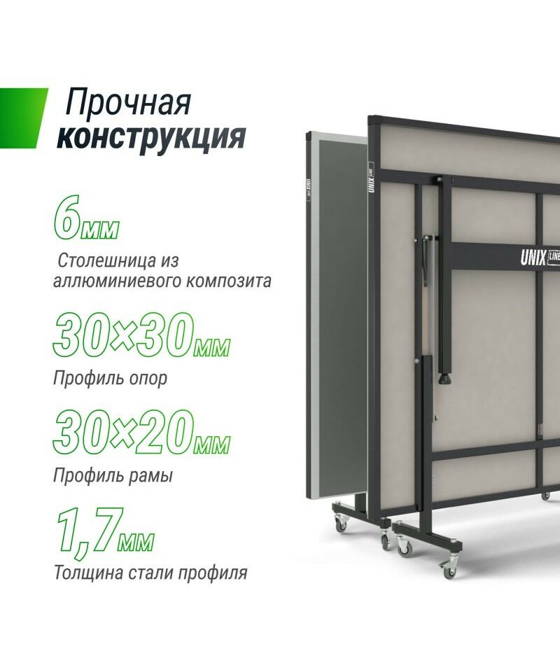 Металлическая рама теннисных столов UNIX Line имеет толщину стали 1,7 мм, а размер профиля опор составляет 30х30 мм, обеспечивая жесткость и устойчивость на различных покрытиях. Опоры теннисного стола также оборудованы компенсаторами неровностей.