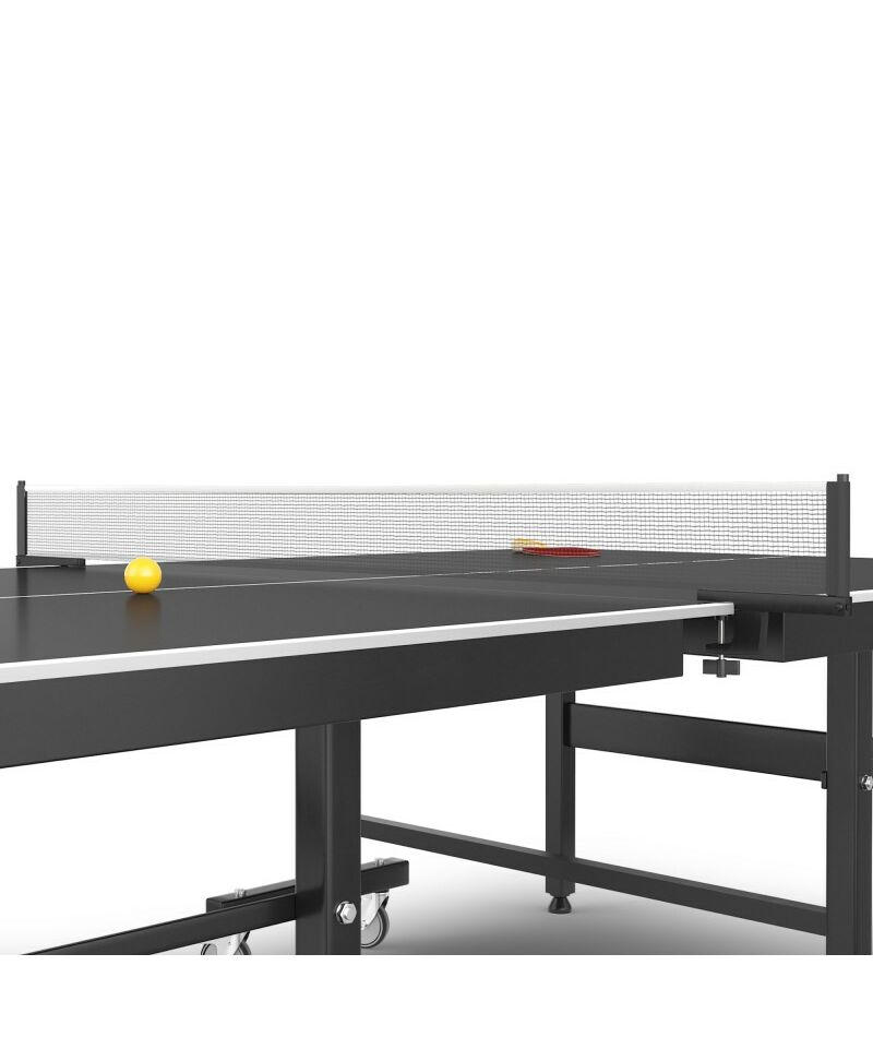 Стол оснащен надежной системой фиксации и тяжелыми ножками, что обеспечивает отличную устойчивость даже при сильном ветре или во время активных игр. Одну из сторон столешницы можно поднять для одиночной игры. Кроме того, наличие колесиков делает его перемещение простым и удобным.