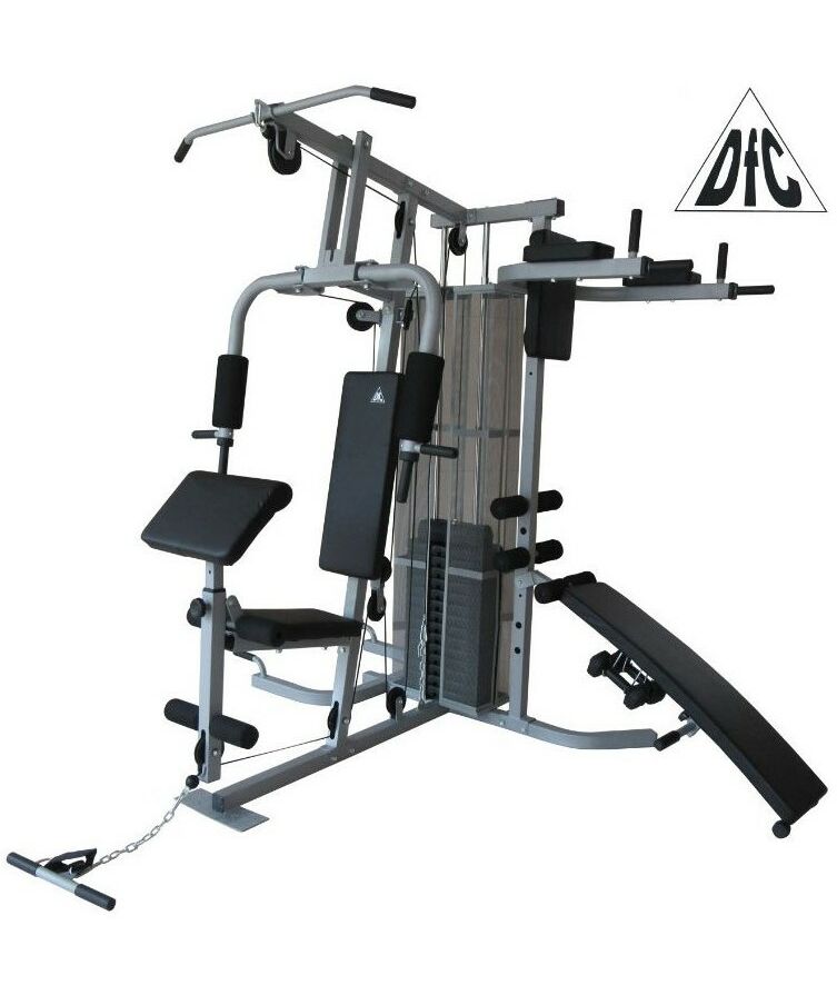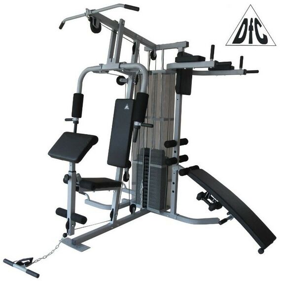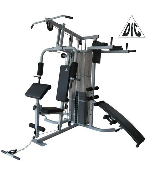 Многофункциональный тренажер с встроенным весовым стеком. Позволяет выполнять комплекс упражнений на различные группы мышц. Дополнительно тренажер имеет брусья для отжимания и скамью для пресса с гантелями по 1,5 кг с регулировкой по углу наклона