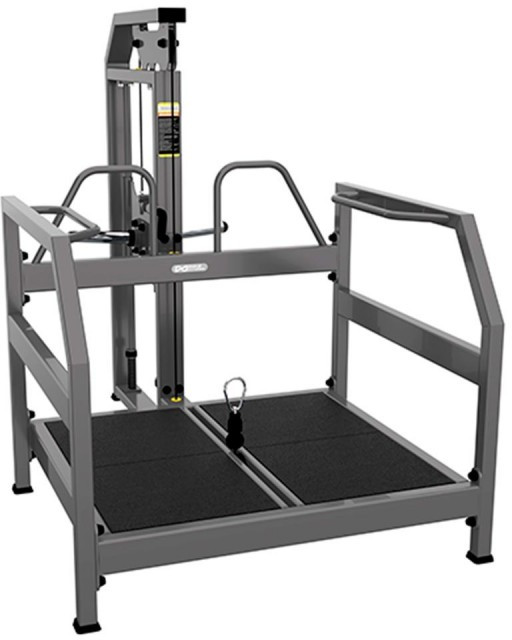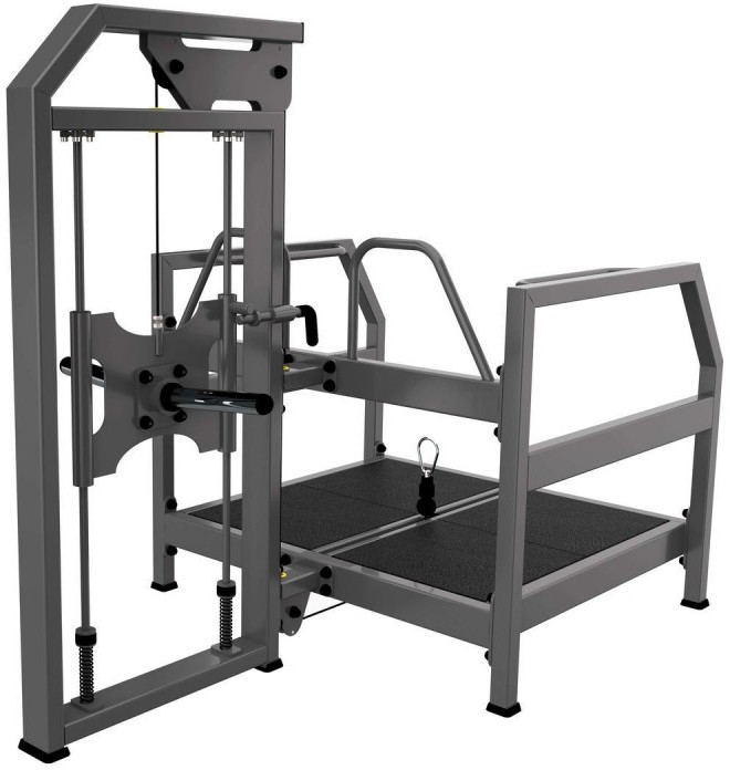 Тренажер для спортивных залов с высокой и средней проходимостью. Предназначен выполнять упражнение приседание с отягощением для тренировки мышц ног и ягодиц. Особенность этого тренажера в том, что спортсмен создает определенные углы нагрузки для ног, чего нельзя добиться при классических приседаниях. в следствие чего нагрузка по-другому распределяется на основные четырехглавые мышцы бедра и большие ягодичные, и другие мышцы нижней части тела, при этом исключается осевая нагрузка на позвоночник. Конструкция тренажера позволяет выполнять приседания с отягощением даже людям, имеющим проблемы со спиной.