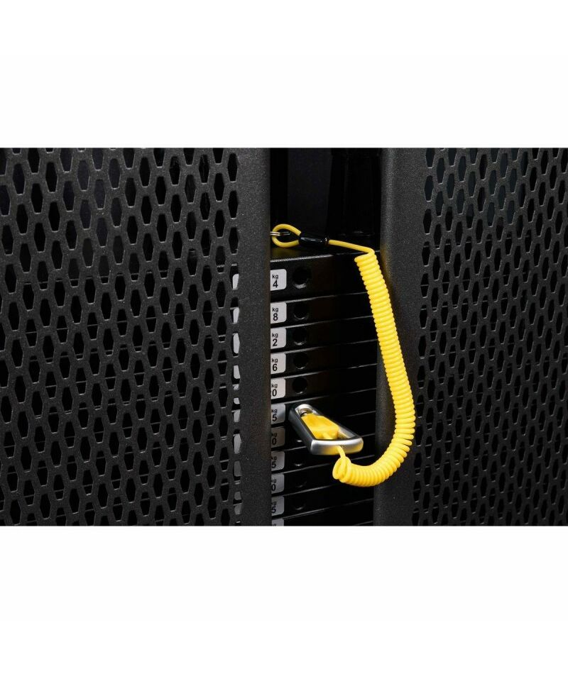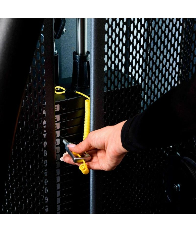 - Металлическая, перфорированная защита весового стека с обеих сторон, выполнена из листового металла толщиной 2мм, с ребрами жесткости у основания, примыкает к несущей раме через скрытое болтовое соединение сечением 6мм в 8 точках, что повышает эстетические и эксплуатационные параметры тренажера.