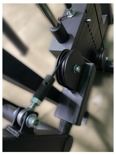 - Стальной латунированный трос с полиуретановой оболочкой повышенной износостойкости плавно передает усилие с опорной площадки на грузоблочный стек.