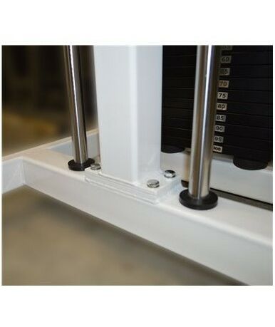 - Основу тренажёра составляет грузоблок, состоящий из девятнадцати стальных фрезерованных по периметру провтуленных ПВХ-вставками пластин весом по 5 кг каждая, зеркально полированных направляющих из нержавейки 25 мм диаметра, хромированного штока и штыревого фиксатора.