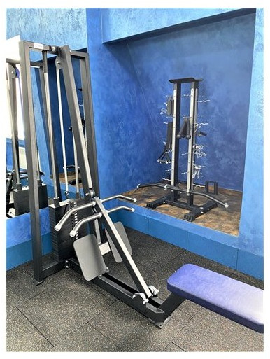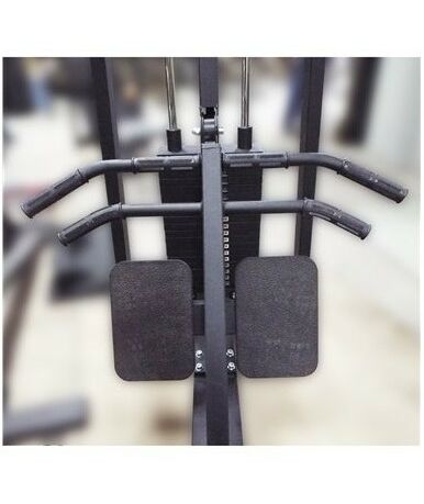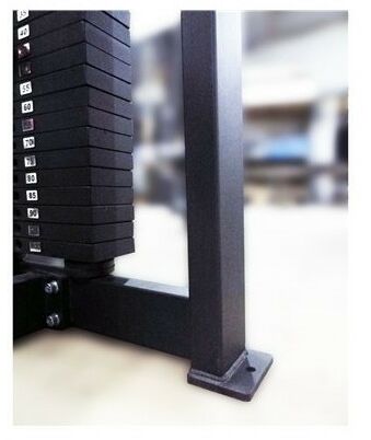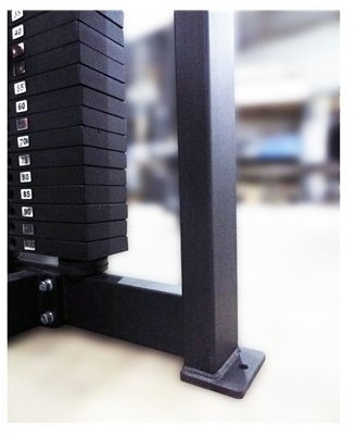 - Грузоблок тренажёра состоит из девятнадцати стальных фрезерованных по периметру провтуленных ПВХ-вставками пластин весом по 5 кг каждая, зеркально полированных направляющих из нержавейки диаметром 25 мм, хромированного штока и штыревого фиксатора.