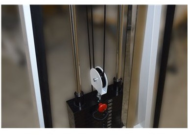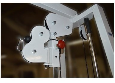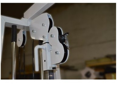 - Нагрузка с грузоблоков на рабочие рукоятки, ремни или манжеты передается через вращающиеся в вертикальной плоскости роликовые блоки (каждый состоит из двух шкивов) посредством стальных тросов толщиной 5 мм в чёрной ПВХ-оболочке (максимальная нагрузка 800 кг).
