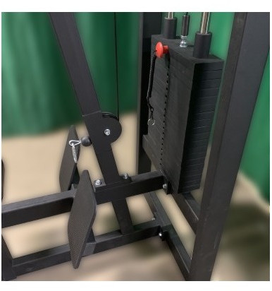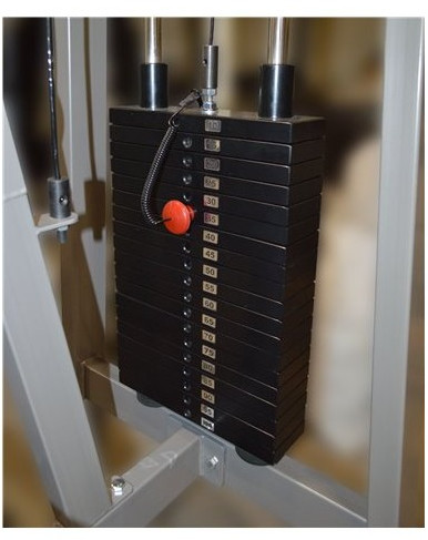 - Грузоблок тренажёра состоит из девятнадцати стальных провтуленных ПВХ-вставками пластин весом по 5 кг каждая, направляющих, штока и штыревого фиксатора.