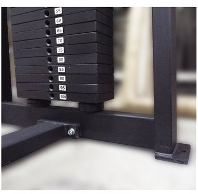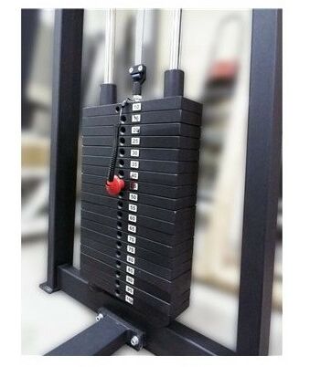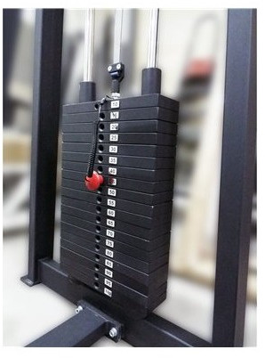 - Грузоблок тренажёра состоит из девятнадцати стальных провтуленных ПВХ-вставками пластин весом по 5 кг каждая, направляющих, штока и штыревого фиксатора.