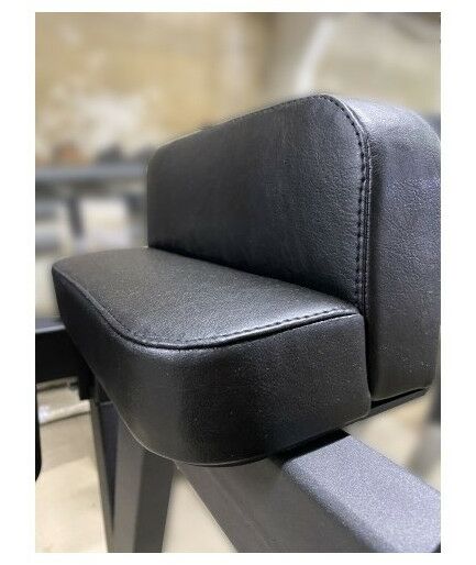 - Также на раме жёстко закреплены спинка, подлокотники с боковыми упорами и рифленые ПВХ-ручки, которые позволяют удобно расположиться на тренажёре для выполнения подъёма ног.