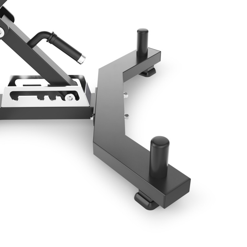 Тренажер для спины оснащен дополнительными адаптерами на которые можно добавлять нагрузку в виде дисков для повышения уровня сложности упражнений. Обрезиненная платформа для ног обеспечивает стабильность и комфорт на протяжении всего упражнения. Высота подушек для упора регулируется под любой рост. Упоры для ног выполнены из металла.