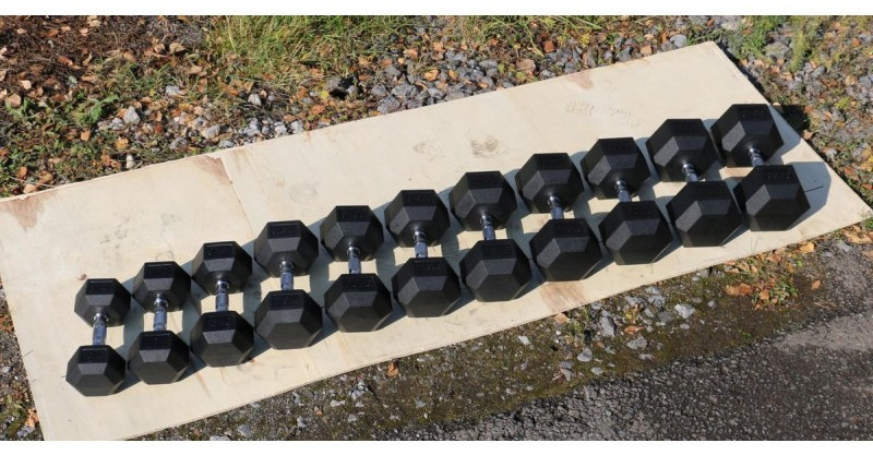 - Гантель имеет обрезиненные шестиугольные грузы. Гексагональная форма грузов и резиновое покрытие предотвращают катание гантелей.