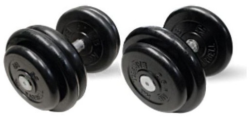 - Гантели собираются из весов в 1,25; 2,5 и 5 кг. и ручек с заглушками