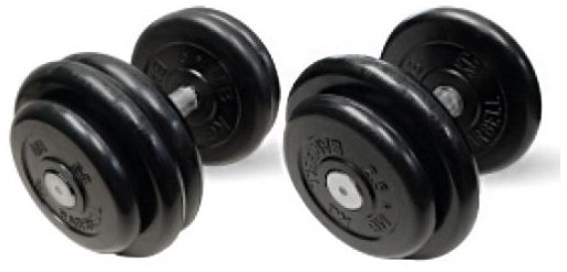 - Гантели собираются из весов в 1,25; 2,5 и 5 кг. и ручек с заглушками