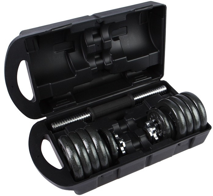 Гантель подходит для тренировок в спортивном зале и дома. Подберите нужный вес и скорректируйте классическую программу упражнений. Рифлёная ручка не проскальзывает во время захвата. Установленные по краям держатели надёжно фиксируют надетые диски. Для правильного хранения и транспортировки весь набор складывается в удобный чемодан.