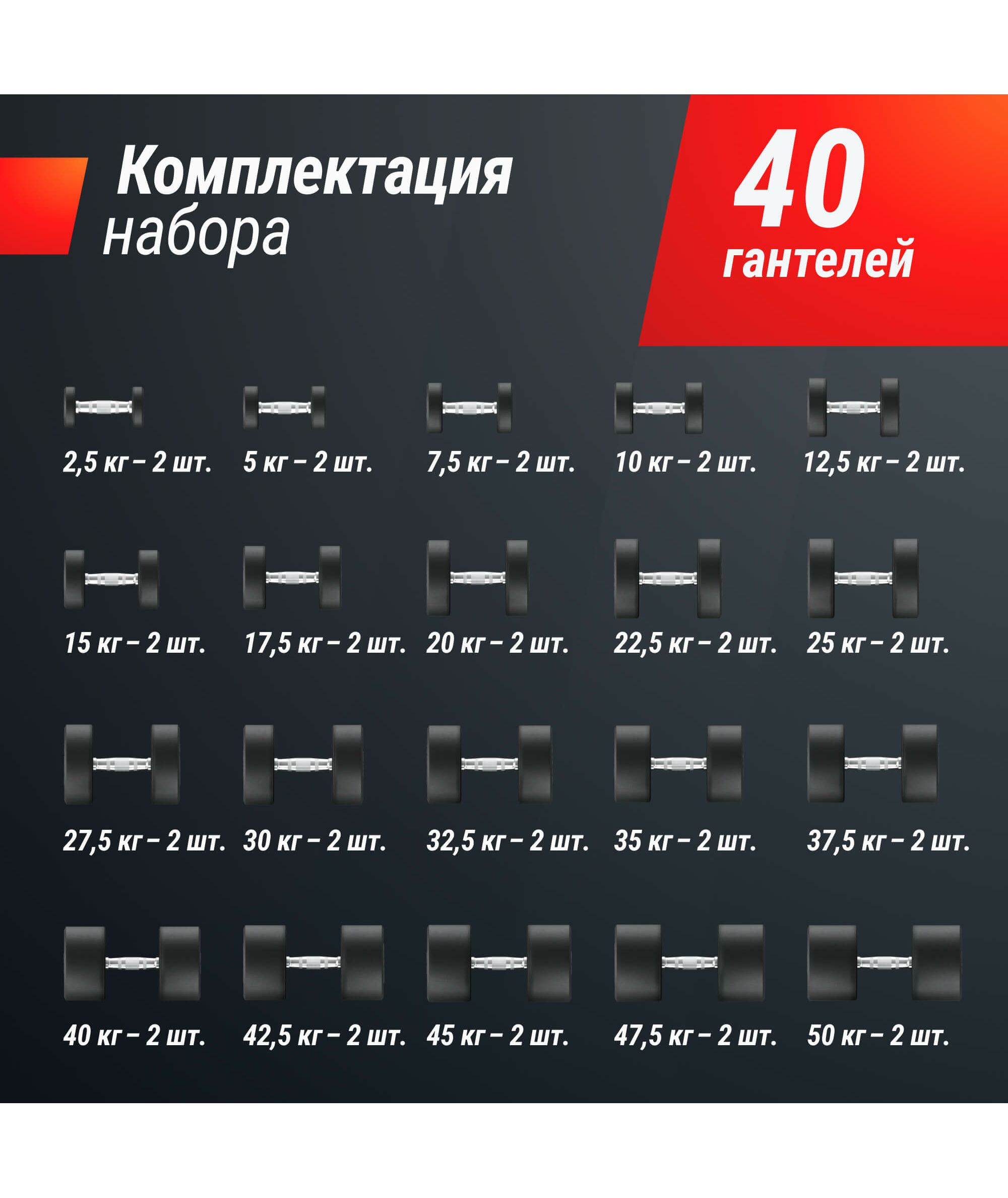 | Комплектация | гантели: 2,5 кг - 2 шт, 5 кг - 2 шт, 7,5 кг - 2 шт, 10 кг - 2 шт, 12,5 кг - 2 шт, 15 кг - 2 шт, 17,5 кг - 2 шт, 20 кг - 2 шт, 22,5 кг - 2 шт, 25 кг - 2 шт, 27,5 кг - 2 шт, 30 кг - 2 шт, 32,5 кг - 2 шт, 35 кг - 2 шт, 37,5 кг - 2 шт, 40 кг - 2 шт, 42,5 кг - 2 шт, 45 кг - 2 шт, 47,5 кг - 2 шт, 50 кг - 2 шт. |