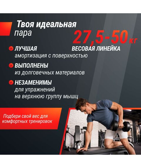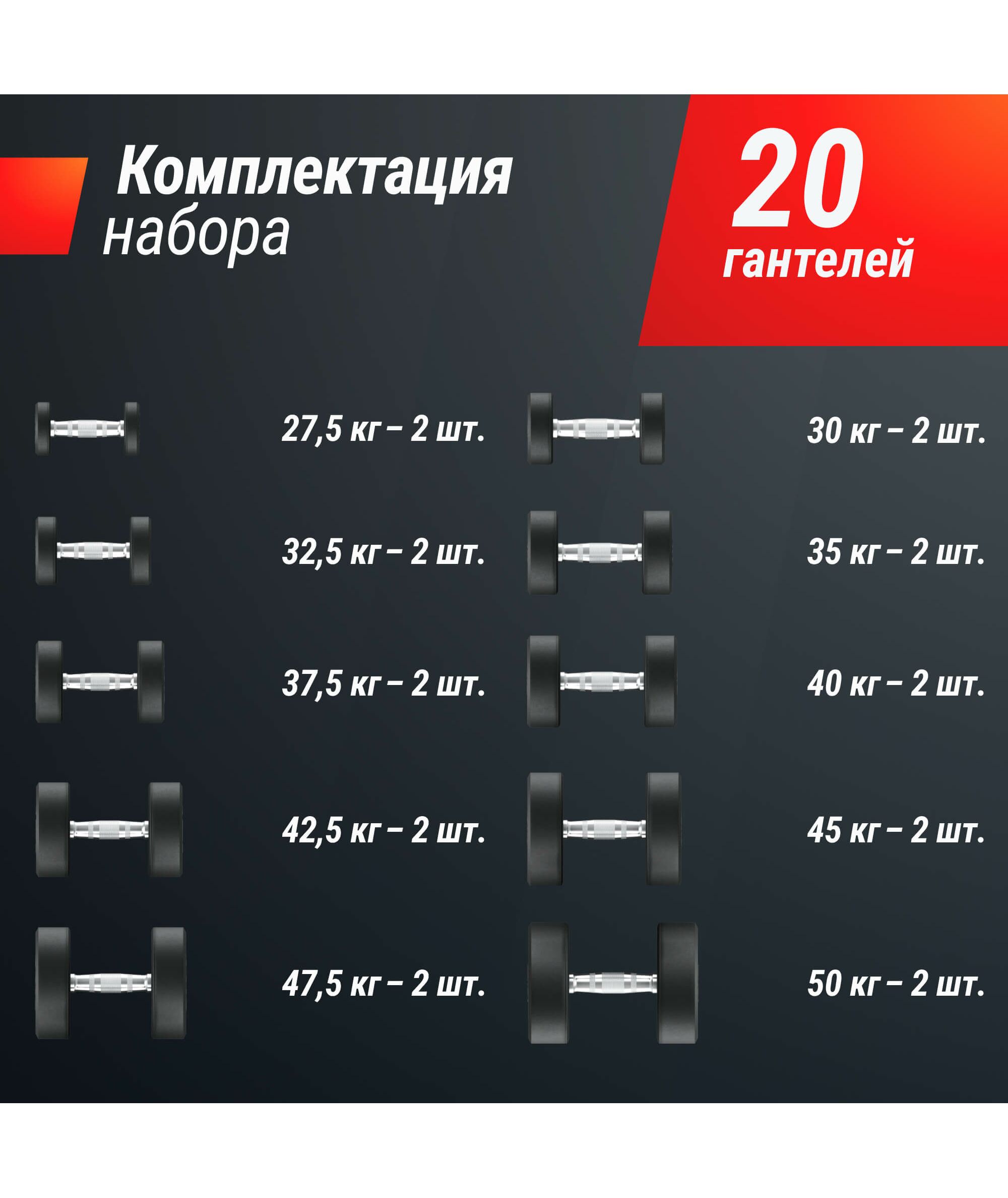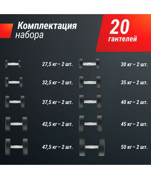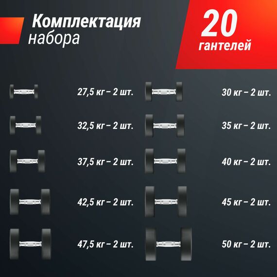 | Комплектация | гантели: 27,5 кг - 2 шт, 30 кг - 2 шт, 32,5 кг - 2 шт, 35 кг - 2 шт, 37,5 кг - 2 шт, 40 кг - 2 шт, 42,5 кг - 2 шт, 45 кг - 2 шт, 47,5 кг - 2 шт, 50 кг - 2 шт. |
