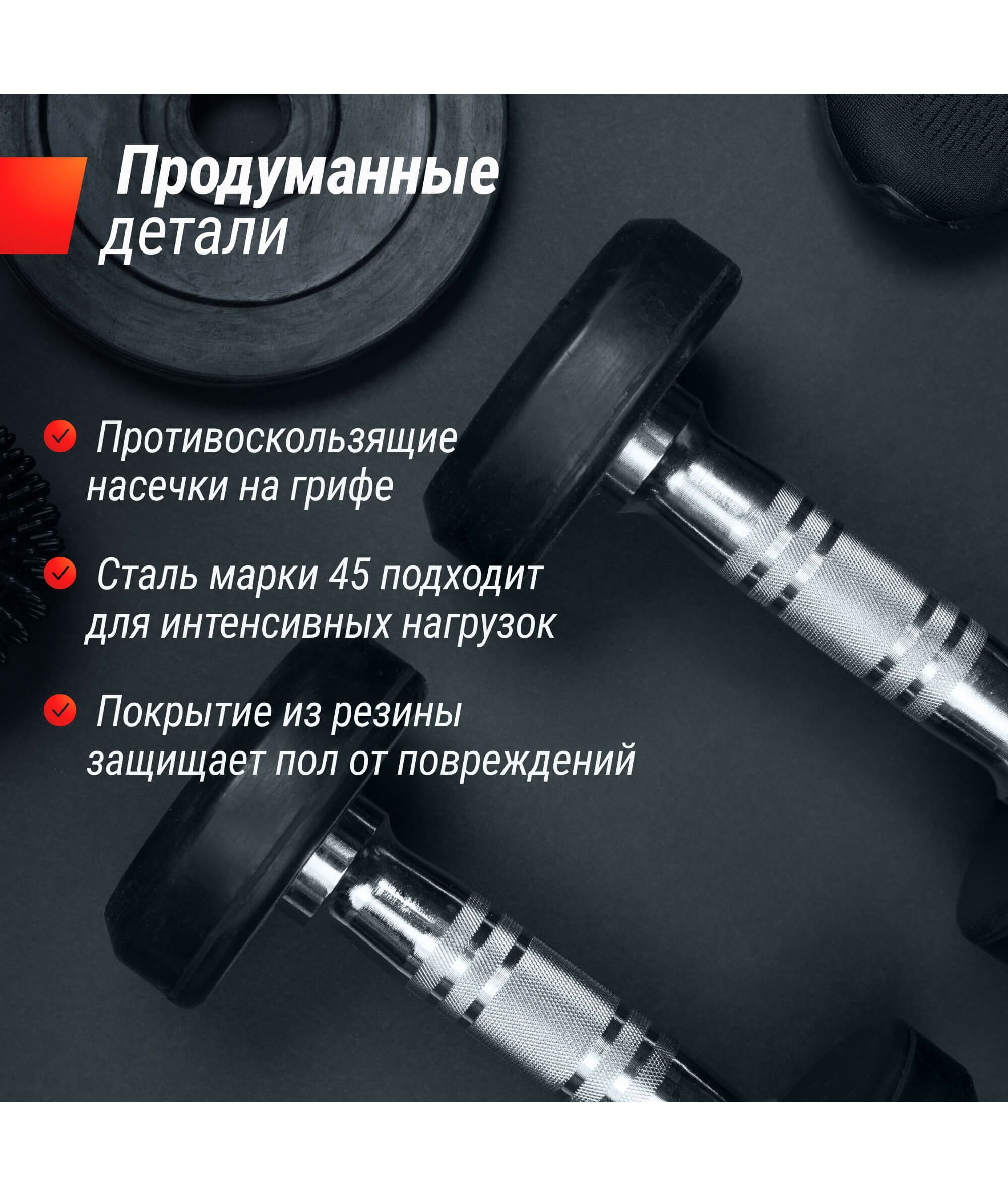 Литая сталь гарантирует использование гантели годами без потери её свойств. Прочное обрезиненное покрытие защищает поверхность гантели от коррозии и повреждений, одновременно обеспечивая устойчивость к ударам и падениям. Данный спорт инвентарь идеально подходит для домашних тренировок и занятий в профессиональных залах.