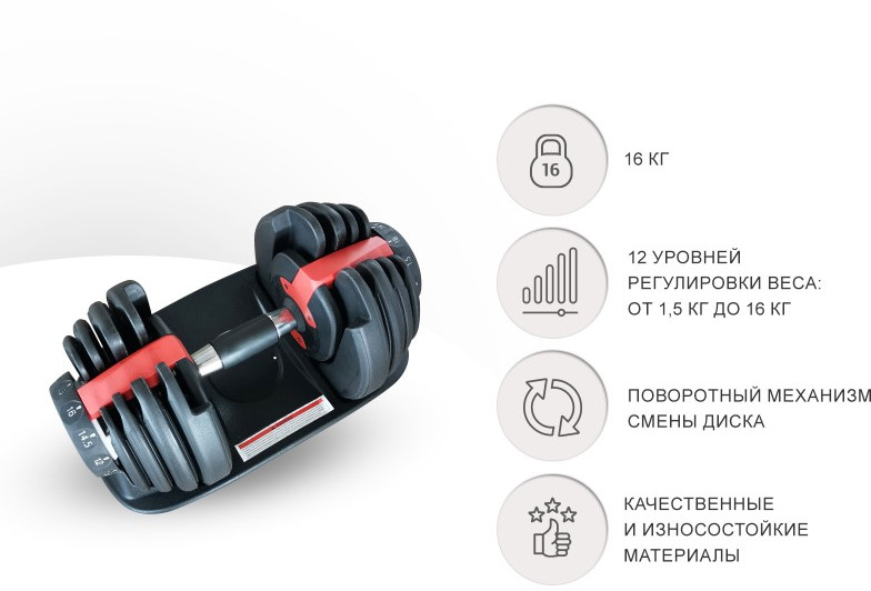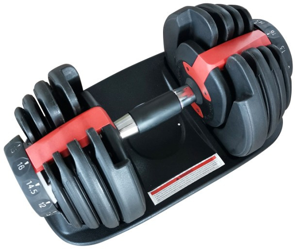- Гантель имеет эргономичную рукоятку и удобные замки-переключатели с обозначением веса нагрузки, расположенные по обоим концам гантели. Благодаря переключателям, можно за несколько секунд изменить и выбрать нужный вам вес.
