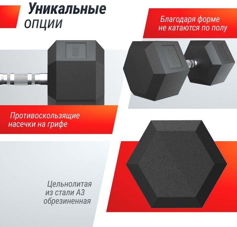 Гантель гексагональная UNIXFIT 40 кг обрезиненная, пара