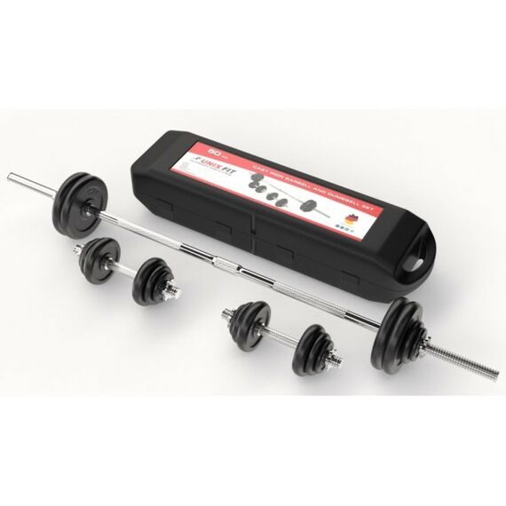 - В комплект входит компактный кейс для хранения и транспортировки гантелей и штанги.