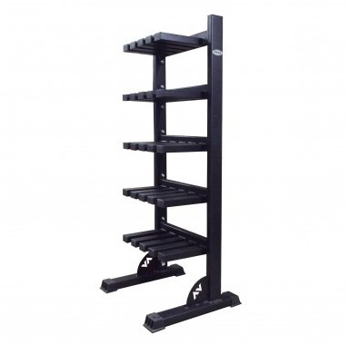 Подставка для хранения гантельного ряда пятиуровневая серии 80 произведена из прямоугольной профильной трубы. Сечение стоек и подставок 80х40х3 мм. Сечение держателей - 60х40х3 мм. Подставка имеет пять уровней для хранения гантелей в вертикальном положении и состоит из двух опор, на которые крепятся держатели для хранения. Опоры подставки, в свою очередь, имеют по паре резиновых подпятников с рифленым основанием без крепления к полу.