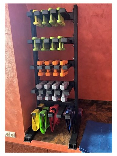 Количество хранимых гантелей указано примерное, т.к. верхние два уровня предназначены для гантелей 0,5 - 1 кг, средний - для гантелей 1 - 2 кг, а нижние два уровня - для гантелей 2 - 3 кг.