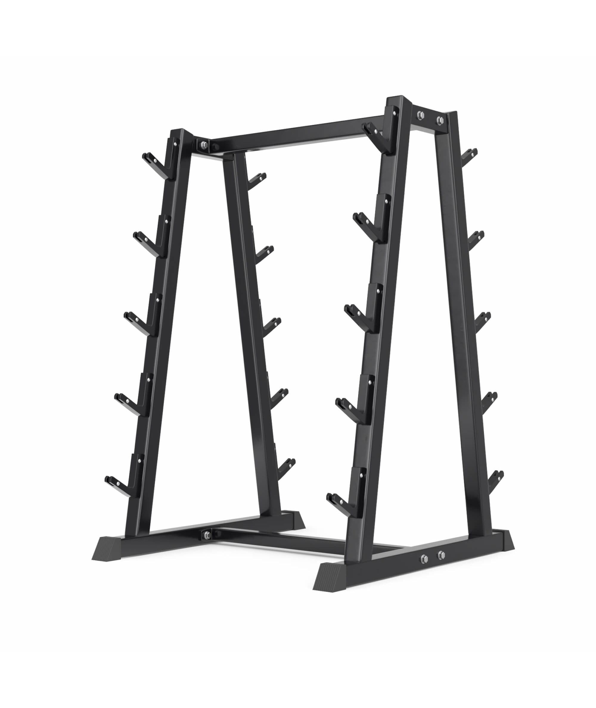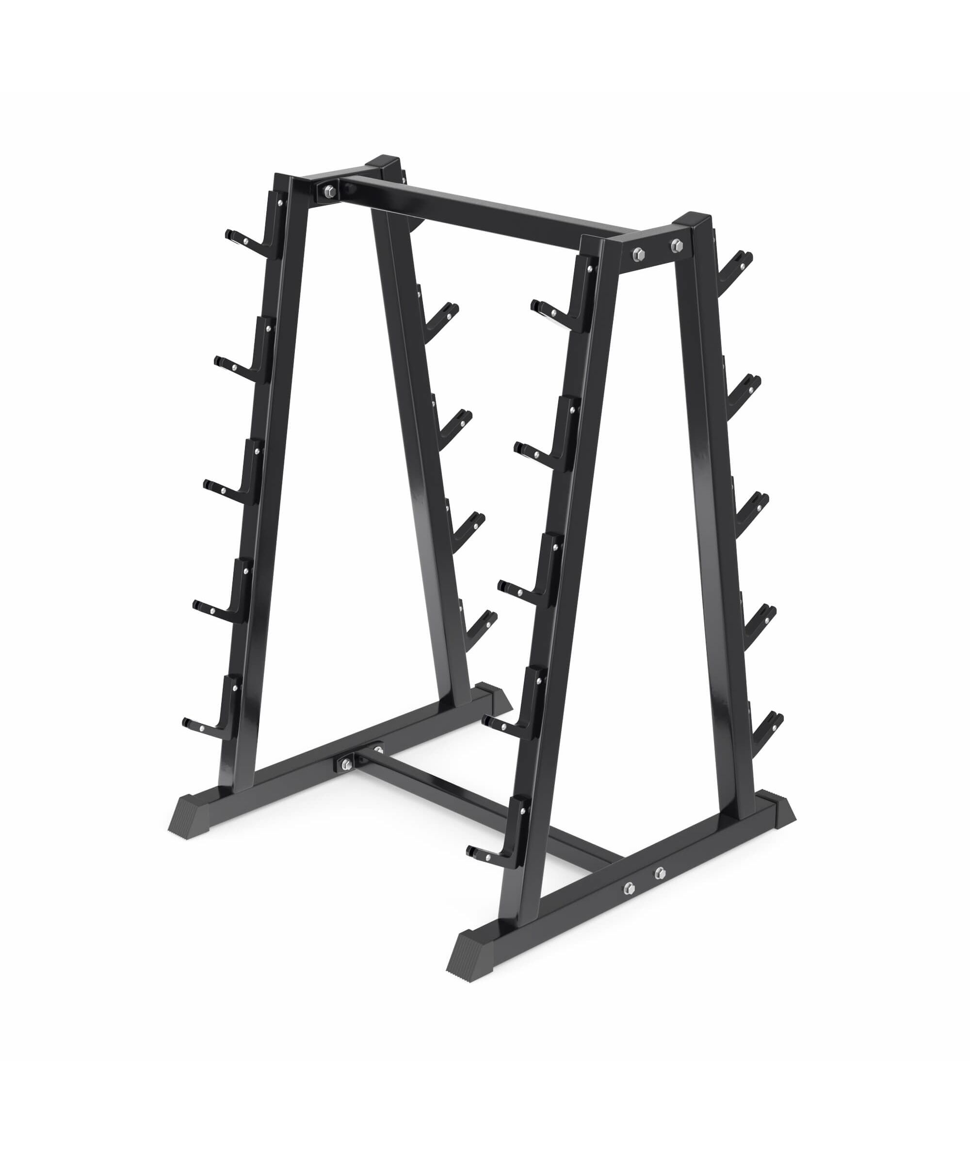 Подставка под грифы и штанги изготовлена из особопрочной стали Q235, которая используется для производства деталей с большим уровнем нагрузки, например для строительства мостов и зданий. Сталь толщиной 1,2 мм обеспечивает надежное и хранение и долговечность. Устойчивая конструкция с прорезиненными ножками позволяет безопасно хранить грифы и штанги различных размеров и весовых категорий, обеспечивая легкий доступ к ним во время тренировок.