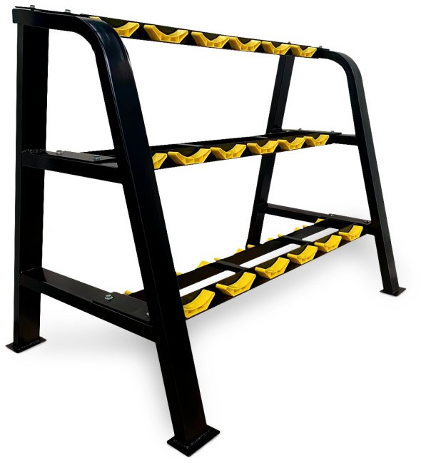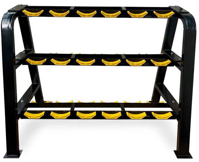 Подставка для гантелей изготовлена из особопрочной стали Q235, которая используется для производства деталей с большим уровнем нагрузки, например для строительства мостов и зданий. Такая конструкция с толщиной стали 1,8 мм обеспечивает надежное и безопасное хранение гантелей различного веса, защищая их от повреждений, сохраняя порядок в тренировочном пространстве. Трехрядная конструкция с противоскользящими ножками обеспечивает удобный доступ к гантелям во время тренировок.