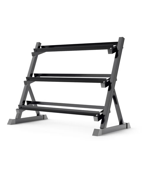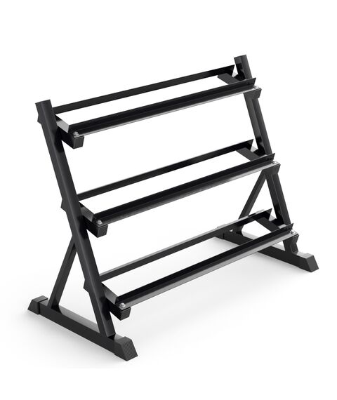 Подставка для гантелей изготовлена из особопрочной стали Q235, которая используется для производства деталей с большим уровнем нагрузки, например для строительства мостов и зданий. Такая конструкция с толщиной стали 1,2 мм обеспечивает надежное и безопасное хранение гантелей различного веса, защищая их от повреждений, сохраняя порядок в тренировочном пространстве. Трехрядная конструкция с противоскользящими ножками обеспечивает удобный доступ к гантелям во время тренировок. Ширина полки для гантелей по внешним границам 22 см, по внутренним границам 11 см.
