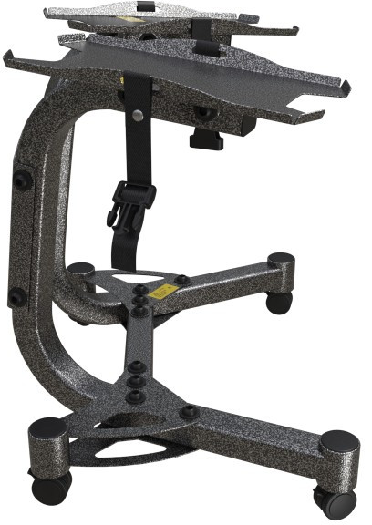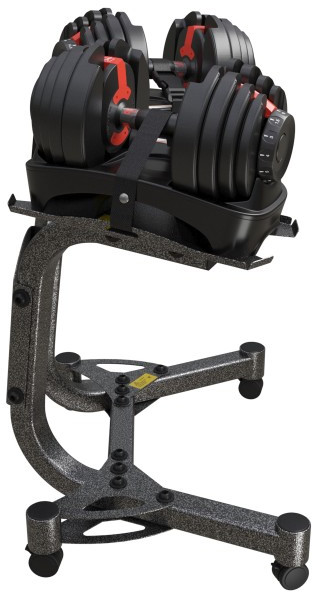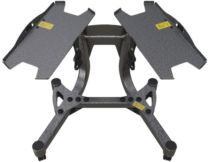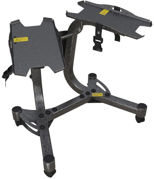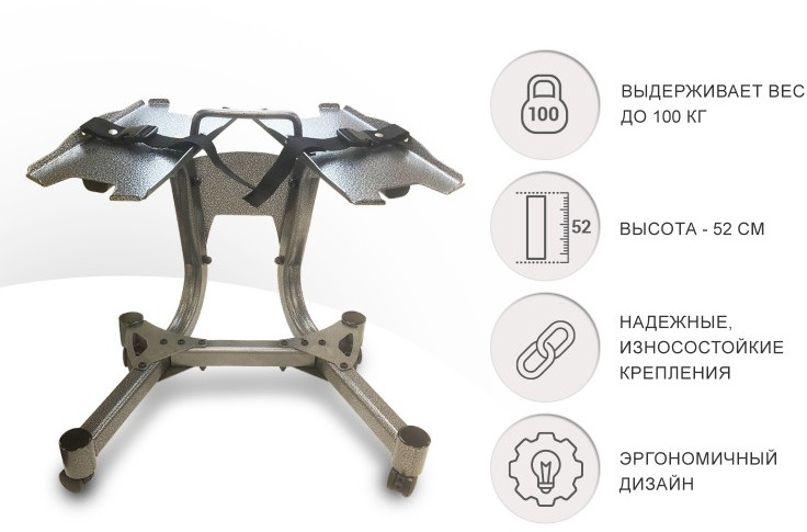 - Комплектация: стойка, колеса для перемещения, ремни для фиксации гантелей