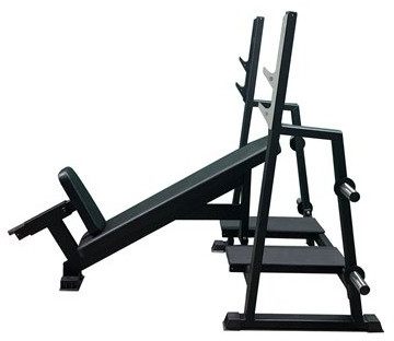 Тренажёр Скамья для жима под углом вверх усиленная AV102/80c состоит из двух рамок в виде стоек для удерживания штанги, опорной конструкции для мягкой части скамьи и регулируемого по высоте сиденья.