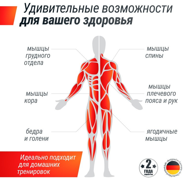 Идеально подходит для домашних тренировок и позволяет прокачать следующие группы мышц: