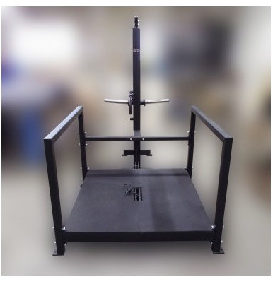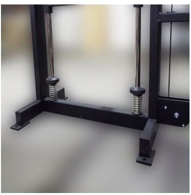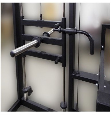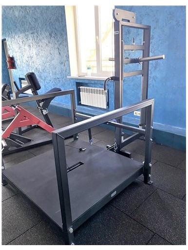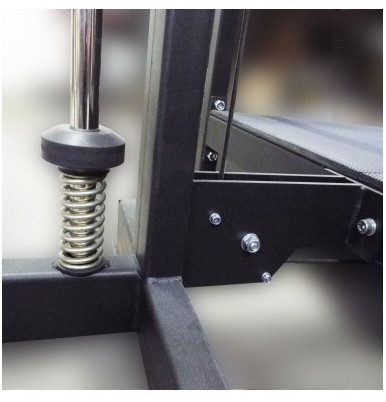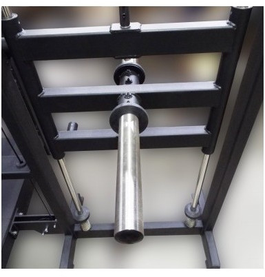 - Для задания нагрузки тренажер имеет движущуюся по двум штокам площадку с держателями для дисков из нержавеющей стали.