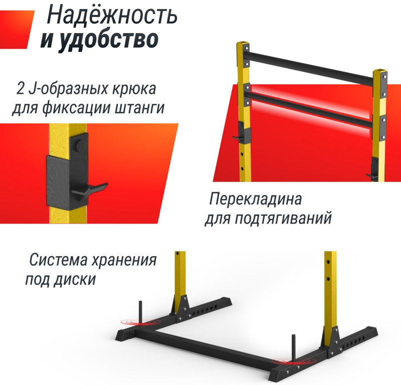 4. Универсальность: турник в конструкции силовой рамы позволит расширить количество упражнений - приседания со штангой, выпады со штангой, становая тяга, подтягивания. Более того, она совместима с большинством типов тренировочных скамей (не входят в комплект), что позволяет осуществлять разнообразные упражнения, включая классический жим лежа.