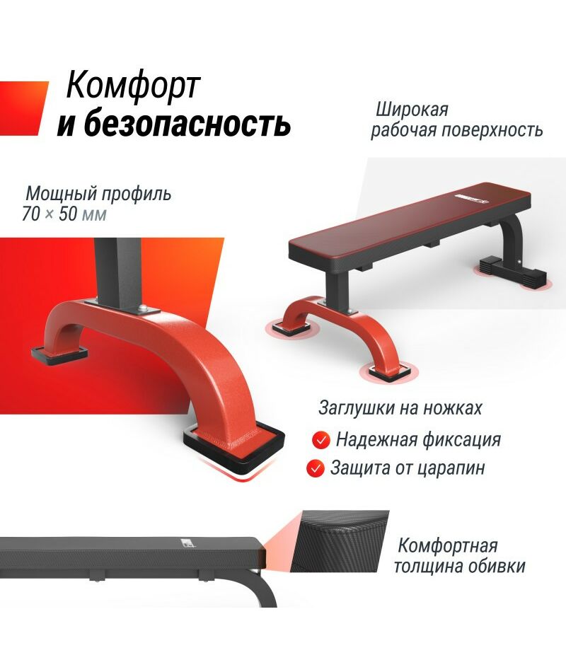 Прочная стальная конструкция из мощного профиля 70 х 50 мм гарантирует надежность и безопасность даже при самых интенсивных нагрузках. Заглушки на ножках позволят избежать скольжения тренажера и царапин на полу. Удобный корпус с тактильно приятной подушкой обеспечит вам максимальное удобство и поддержку во время тренировок. Несмотря на компактные размеры спортивной скамьи, рабочая поверхность остается достаточно широкой для комфортного использования.