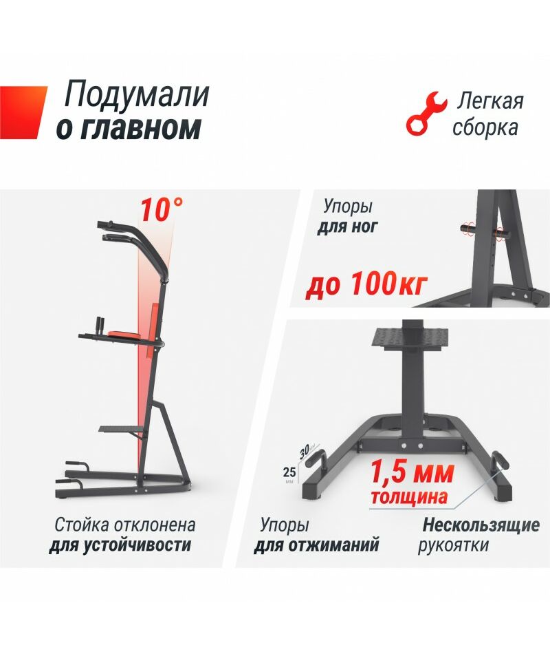 Ножки тренажера оснащены специальными накладками, которые защищают напольное покрытие во время тренировок. Каждый элемент многофункциональной стойки продуман до мелочей. Спинка и упоры для рук изготовлены из износостойкой эко-кожи, которая не скользит и не впитывает влагу. Эргономичная подушка спинки размером 50 х 26 х 4,5 см обеспечивает максимальный комфорт и удобство во время тренировок, а нескользящие рукоятки гарантируют безопасность при выполнении упражнений. Благодаря использованию высококачественных материалов тренажер станет вашим надежным спутником на долгие годы.