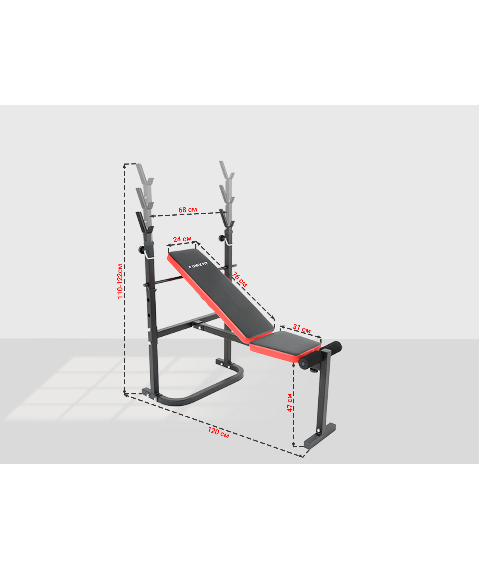- Стойки под штангу регулируются по высоте от 110 см до 122 см;