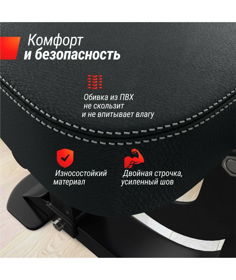 Каждый элемент многофункционального тренажера продуман с учетом всех деталей. Обивка из ПВХ высокого качества не скользит и не впитывает влагу, двойная строчка усиливает шов, что делает элементы тренажера износостойкими. Ножки силовой скамьи оснащены специальными накладками, которые защищают напольное покрытие во время тренировок и не дают скользить. Благодаря использованию высококачественных материалов тренажер станет вашим надежным спутником на долгие годы.