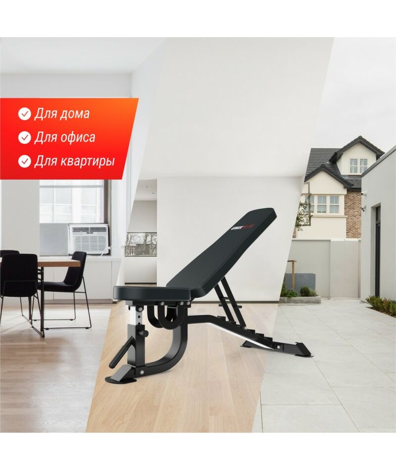 Конструкция скамьи для жима и пресса разработана так, чтобы совместить компактные размеры 130 x 54,6 x 95 см в рабочем состоянии, с надежностью и прочностью изделия, ведь тренажер выполнен из усиленного стального профиля и способен выдержать общую нагрузку до 270 кг. Устойчивая конструкция позволяет выполнять самые интенсивные упражнения совершенно безопасно.
