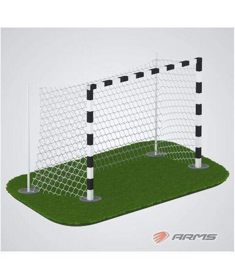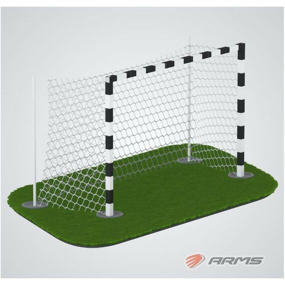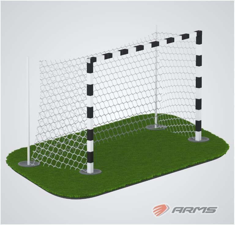 - Ворота закрепленные в установочных гильзах. Задние стойки изготовлены из трубы диаметром 42,3 мм и оснащены крюками для натяжения сетки. Глубина установки гильзы – 360 мм от уровня покрытия. Уровень гравия должен быть выше дна гильзы на 20 мм - для обеспечения дренажа