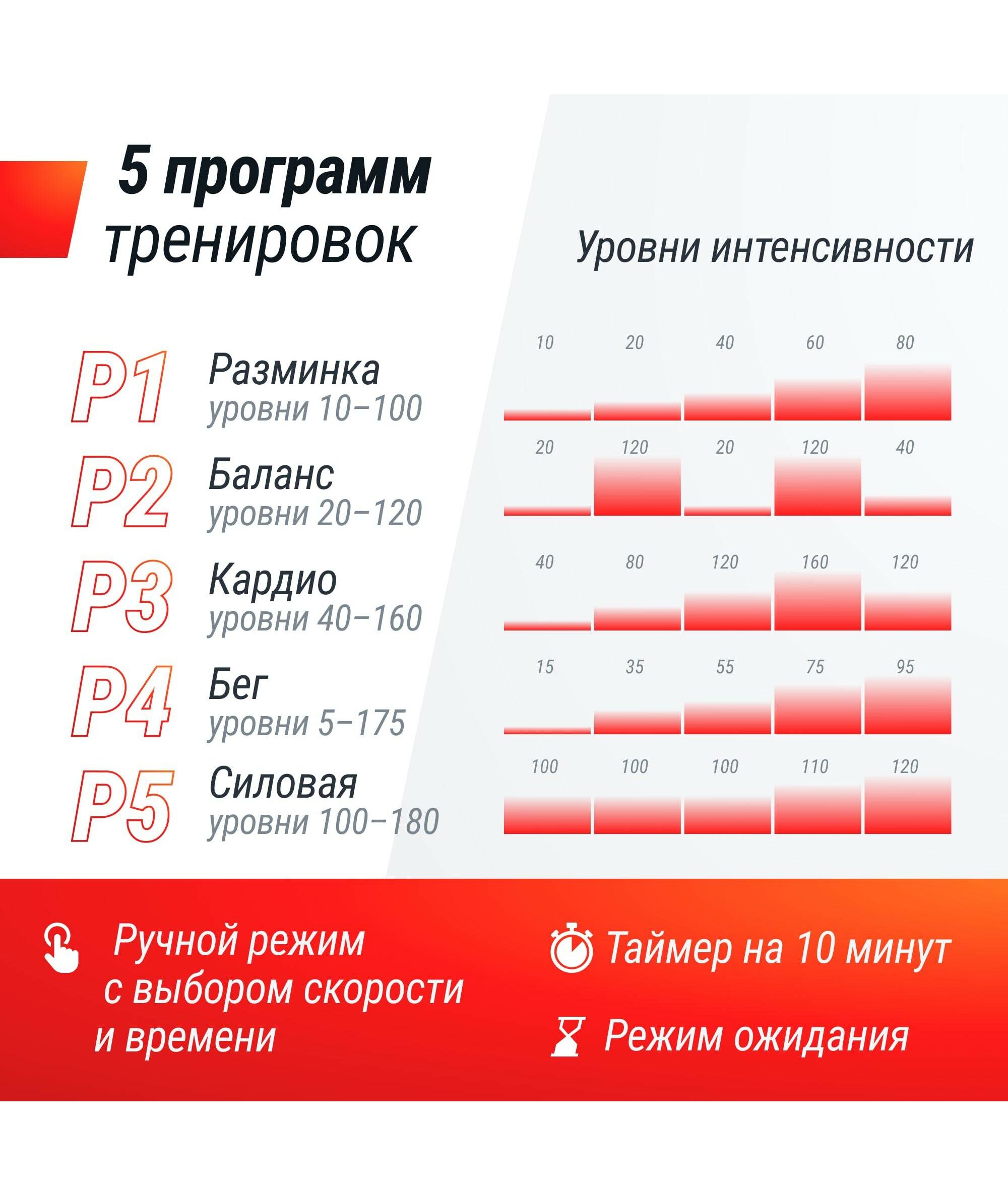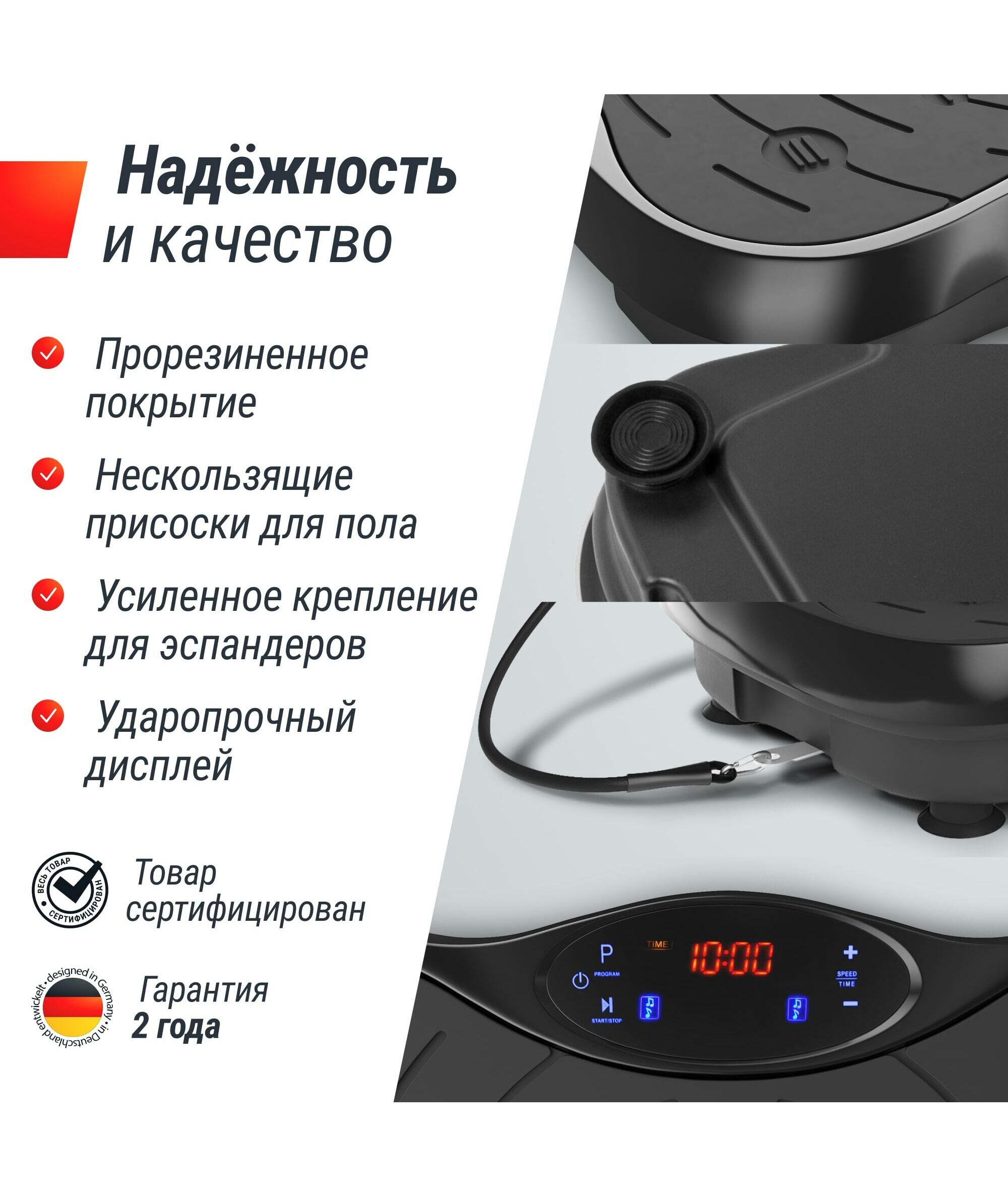 3. Многофункциональность: Платформа предлагает различные режимы вибрации и интенсивности, а также 9 предустановленных программ, что позволяет адаптировать тренировки под ваши цели — от похудения до укрепления мышц. Таймер на 10 минут поможет контролировать ваши тренировки.