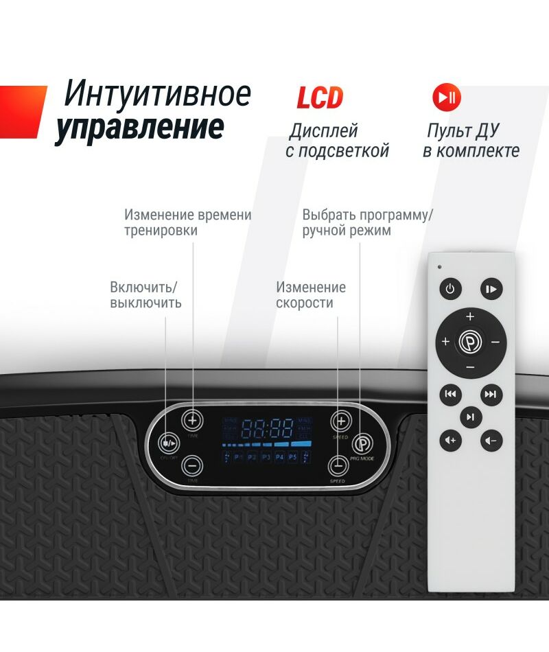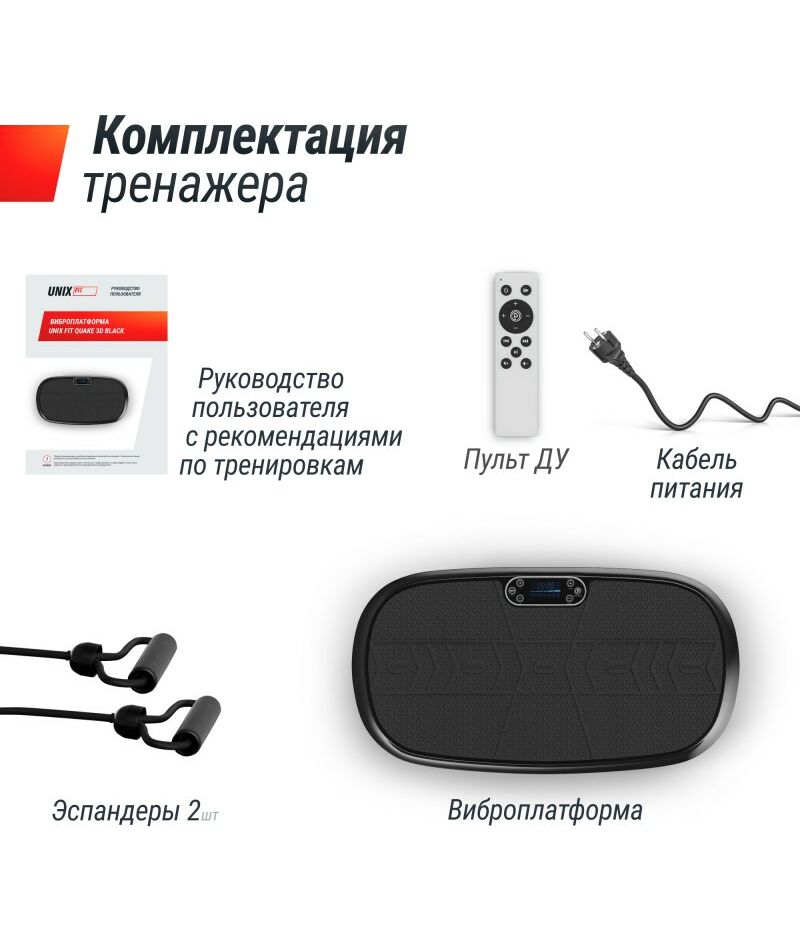 | Комплектация | Виброплатформа, кабель питания, пульт управления, эластичный трос (2 шт.), руководство пользователя |